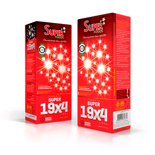 Foguete 19×4 tiros Premier Fogos, foguete de alto desempenho com grande quantidade de disparos, criando um espetáculo prolongado de fogos de artifício, indicado para festas de fim de ano, eventos corporativos e celebrações maiores.